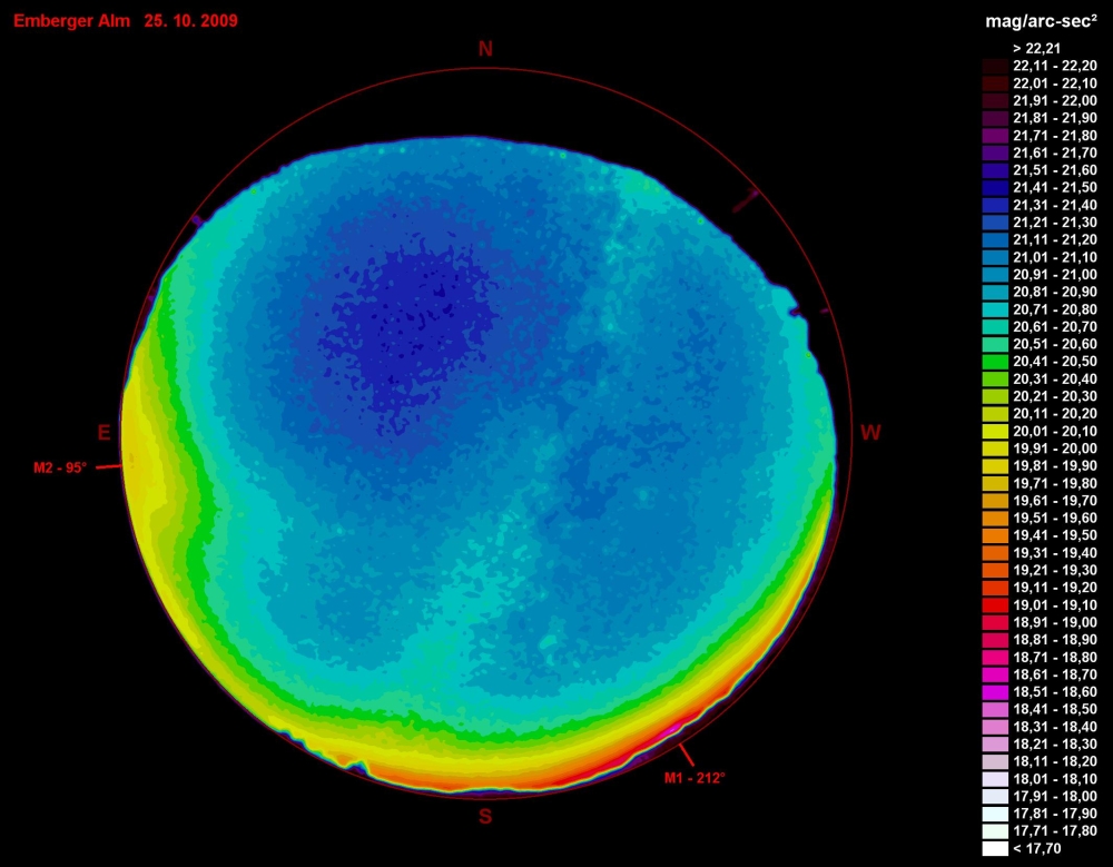 Photo 1 (up): allsky image obtained at Emberger Alm (1900 m) on Oct. 26, 2009 (4h28UT) with Canon 5D DSLR and 8mm, f/3.5 Sigma fisheye lens. Exposure time was 3 minutes at ISO 1000. The main sources of artificial light that affect the sky brightness over the Nockberge are coming from Slovenia (south), NE Italy (SW) and Switzerland (west). Photo 2 (down): Sky brightness map of left image obtained with software prepared by DS Slovenia. Copyright © 2009 by A. Mohar, Dark Sky Slovenia