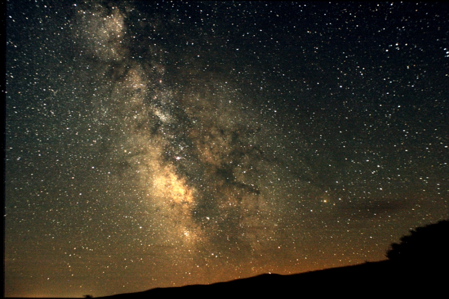 This true color view was taken on 2005 July 6.9UT. It is a composite image, made by adding four 30 second exposures obtained from a fixed tripod with Canon EOS 20D camera and 20 mm lens. In order to reduce the image smear due to Earth rotation, the camera sensitivity was boosted to ISO 1600. Stars down to -42o declination are visible just over the southern horizon (middle of frame). Some clouds moved over the horizon during the exposure, slightly reflecting the HP sodium light from the distant towns of Osor and Mali Losinj. Copyright © 2005 by H. Mikuz, Crni Vrh Observatory.